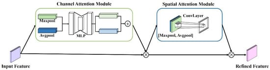 In the channel attention module, the input feature is input to the maximum pooling (Maxpool) and the average pooling (Avgpool) layer, respectively, to generate two different features. Both features were then forwarded to the multilayer perceptron (MLP) to produce the channel attention map . The formula is as follows: