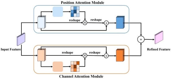 The DA module also has a position attention module and a channel attention module, but it adopts a parallel instead of a series architecture (Figure 2). The process involves inputting the feature maps into the position attention module and the channel attention module separately, then their output feature maps are added element by element to obtain the output feature map of the DA module.