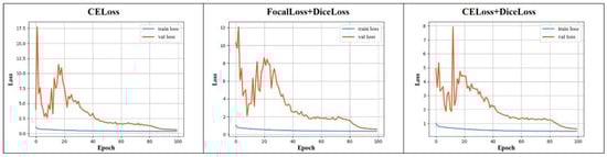 The decision of a suitable loss function is an important premise for deep learning model selection. The loss function describes the degree of disparity between the predicted result and the ground truth, and the value of the loss function directly reflects the performance of the model. Using different loss functions for the same model will bring different effects. Therefore, to ensure that the model achieves the best effect, it is necessary to select an appropriate loss function. CELoss is the most popular loss function used for multiclass classification, which is suitable for situations where each type in the dataset is independent but not mutually exclusive. DiceLoss is usually used for the loss evaluation of datasets with similar samples. Focal loss [32] is a more suitable choice for dealing with difficult datasets with imbalanced data distribution. Thus, in this study, we focused on three loss functions, CELoss, CELoss + DiceLoss [33], and FocalLoss + DiceLoss, to determine which was most suitable for the dataset we selected.