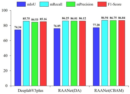 We evaluated the overall performance of the three models using mIoU, mRecall, mPrecision, and F1 score to determine whether the integration of the attention module enhanced the expressiveness of the spatial and channel information from the images. As shown in Figure 6, the mIoU, mRecall, mPrecision, and F1 score of RAANet (DA) were improved by 1.71%, 1.5%, 1.48%, and 0.96%. RAANet (CBAM) was more accurate, with mIoU, mRecall, mPrecision, and F1 score improved by 2.94%, 1.19%, 2.22%, and 1.68%, respectively.