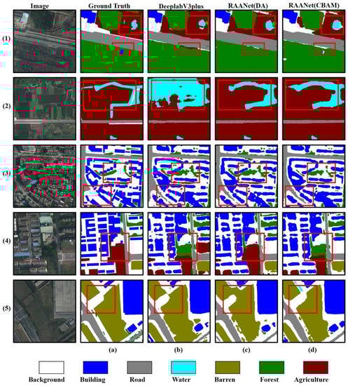 - From the perspective of land use categories, the role of the RAANet (CBAM) differs from that of the RAANet (DA). RAANet (CBAM) has a better prediction effect on background, building, road, water, and forest categories, while RAANet (DA) has a better prediction effect on the road, barren, and forest categories.