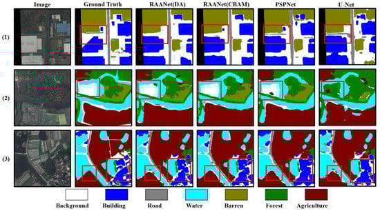 We selected the land use categories of remote sensing images as an example and applied the different models to determine the differences in the predictions produced by RAANet (DA), RAANet (CBAM), PSPNet, and U-Net. The results are shown in Figure 8.