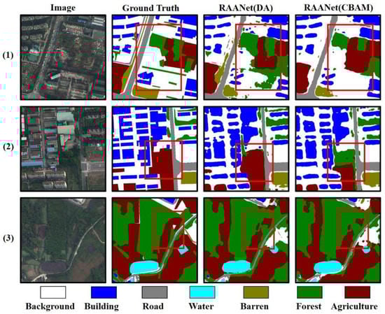 The results showed that RAANet (DA) reduced the number of the correctly predicted pixels in the water category but increased in the other categories. RAANet (CBAM) correctly predicted more pixels in the background, building, road, and agriculture categories. The RAANet (DA) performed better in the road, barren, and forest categories than the other two models, but was lowest in the water category. The RAANet (CBAM) was best in the background and building categories.