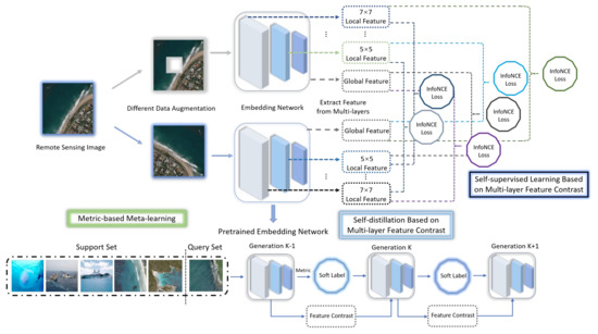 The first term and the fourth term, the second term and the fifth term are dual relations. Therefore, we set equal coefficients for them. Here, we expect the embedding network to learn a good representation of local features and global features by multilayer feature contrast. The comparisons of global features with local features and of local features with local features at different locations are what we need. Therefore, we will not discuss here which one of them is more important and will assign the same coefficients to them as well. Gather the positive samples continuously from the same remote sensing image, push away total negative samples from other remote sensing images, and integrate the contrast loss of local features and global features into the learning objective. By combining these two losses, we make use of the stability of NCE loss in few-shot scenarios and improve the feature extraction ability of embedding networks when we obtain more transferable embedding networks. In the training process, the probability of the embedding network using the correct category is maximized by continuously reducing until it is stable at the minimum value. At this time, the self-supervised learning ends, and an embedding network with the ability to extract global and local features of remote sensing images is obtained.