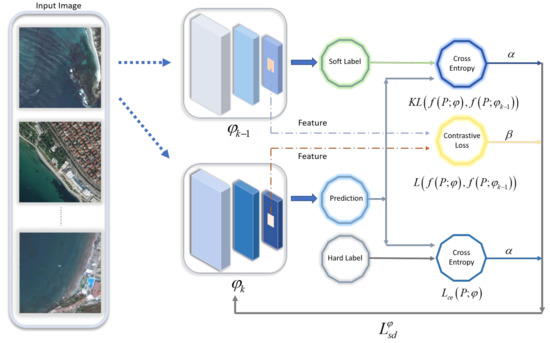 Figure 2, we add the difference of feature level to the self-distillation: the difference of the feature extracted from a remote sensing image between the convolution of a layer in the K-generation model and the same layer in the K-1 generation model. The feature distillation can be focal distillation or global distillation, which bridges the gap between the contexts of the adjoining generations.