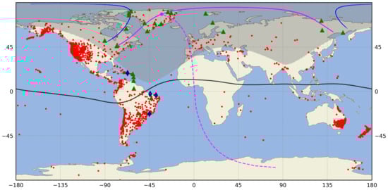 For the final selection of the RINEX files of each GNSS station, we took into account several aspects. First, we considered the quality of the files during the selected period of days (DoYs 159–163). Second, we verified that there were no errors or data-gap after TEC estimation and post-processing PPP-AR. This aspect is critical to relating TEC and/or ROTI with positioning variations. We used data from all available stations in the polar regions. We also tried to cover regions such as Africa, Australia, and Asia. The International GNSS Service (IGS) stations (http://www.igs.org, last accessed on 17 January 2022) []; the Chilean network of GNSS receivers operated by the National Seismological Center at University of Chile (CSN in Spanish); University NAVSTAR Consortium (UNAVCO); the Argentine Continuous Satellite Monitoring Network (RAMSAC in Spanish) []; the Brazilian Network for Continuous Monitoring of the Institute of Brazilian Geography and Statistics (IBGE in Portuguese); the Geoscience Australia; the Low-Latitude Ionospheric Sensor Network (LISN, http://lisn.igp.gob.pe/, accessed on 26 July 2021); and the African Geodetic Reference Frame (AFREF) provided RINEX files of 2337 GNSS stations that met the requirements we imposed (see Figure 1).
