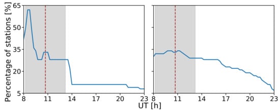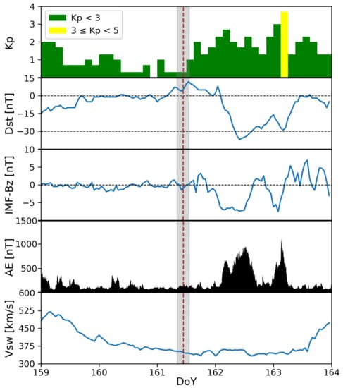 The Auroral Electrojet index (AE) is a good proxy of the geomagnetic activity level at mid/high latitudes [,]. Following De Michelis et al. [], we selected two distinct datasets corresponding, respectively, to geomagnetically quiet (AE < 50 nT) and active (AE > 300 nT) periods. Figure 2 also illustrates that the AE index was over 500 nT between 5 and 15 UT on DoY 162, and between 1 and 5 UT on DoY 163; so these time periods showed some activity in the auroral regions. Since these days are used by comparison with the day of the eclipse, these periods of time were treated with care to avoid interfering with the eclipse analysis.