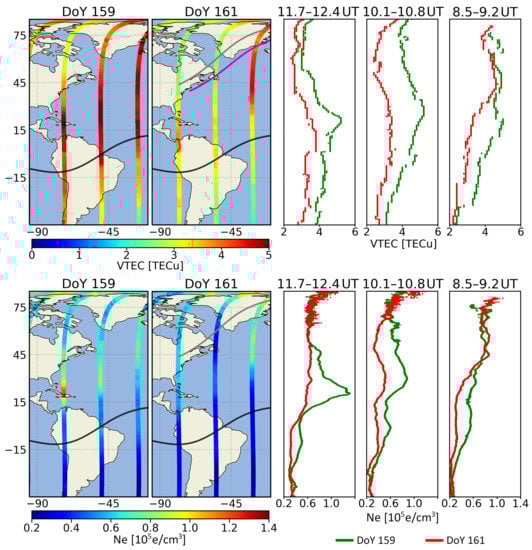 The results obtained with the GNSS stations at 350 km (see Figure 3 and Figure 8) were consistent with the ionospheric TEC behavior at 400 km above the Swarm-A (see Figure 4). At P1 time, we observe a TEC depletion (∼ TECu, ) in the central Atlantic region, where the eclipse started and its conjugate. The greatest TEC reduction (∼ TECu, ) occurred at GE time (see Figure 4 (upper panels)). This TEC value was similar to that reported by Cherniak and Zakharenkova (−2 to −1.5 TECu) []. From Figure 4 (buttom panels), we were also able to show that the disturbance remained in the North and South American regions (TEC ∼−30%) even though the eclipse was already over the northern European and Asian regions. Moreover, we can observe a close similarity in the behavior of in situ Ne and VTEC (see Figure 4). Furthermore, the results of ionospheric plasma depletion using Swarm-A LP were consistent with the findings presented in [].