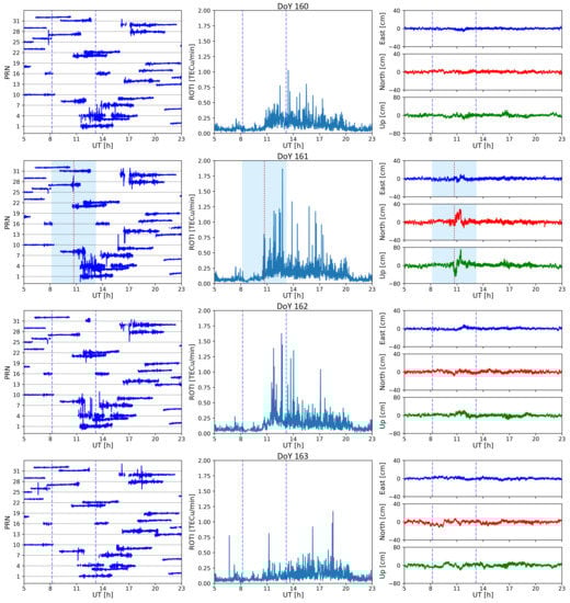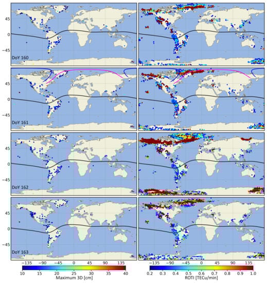 ROTI was calculated as described in Section 2.2 to study the relationship between the variation of TEC and the positioning error for the eclipse. The images in the Figure 6 (right panel) show five maps of ROTI, each representing the stations that had ROTI greater than 0.25 TECu/min. Each map represents a different day, but at the same time as that of the solar eclipse, DoYs 160–163 between 8 and 14 UT. We do not show the maps for DoY 159 because they are similar to those for DoY 160.