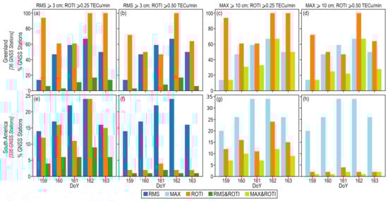 Behavior of the maximum 3D positioning error, 3D-RMS, and ROTI in Greenland and South America sectors, where 36 GNSS stations are localized in Greenland (upper panels) and 335 GNSS stations are situated in South America (bottom panels). Percentage of GNSS stations where (a,b,e,f) 3D-RMS ⩾ 3 cm; (c,d,g,h) maximum 3D position ⩾ 10 cm; (a,c,e,g) ROTI ⩾ 0.25 TECu/min; and (b,d,f,h) ROTI ⩾ 0.50 TECu/min. Percentage of GNSS stations meeting 3D-RMS (blue bars); maximum 3D positioning error (light blue bars); ROTI (orange bars); 3D-RMS and ROTI (green bars); and maximum 3D positioning error and ROTI (light green bars) values.