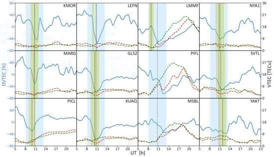 The behavior of the ionospheric TEC during the 10 June 2021 Annular Solar Eclipse in 12 of the 24 selected GNSS stations. DVTEC[%] (blue line), VTECe (red dashed line) and (green dashed line). The GNSS stations are ordered by latitude and then by longitude. P1–P4 time is represented by the light blue bar, C1–C4 time by the yellow bar, MOT by black dotted line, and GE time by the red dotted line.