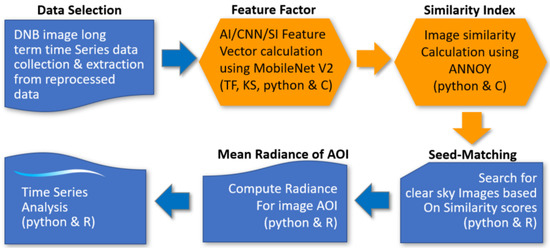 Algorithm Flowchart for Urban Night Light Long-Term Time Series Analysis (blue = developed by the authors; orange = adopted and integrated).