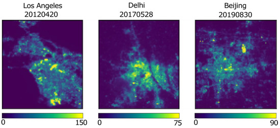 The metropolitan areas used for this study to demonstrate our methodology included Los Angeles, Beijing, and Delhi (Figure 4). These cities are chosen based on a combination of cloud frequency, urban growth, and climate types. We believe that the methodology is applicable to all major metropolitan areas with a size greater than 50 × 50 km2 in area, given the spatial resolution of VIIRS DNB of 750 × 750 m2. The metropolitan areas of interest (AOI) in this study are somewhat arbitrary but selected based on several considerations. (1) The exact same area (based on latitude/longitude coordinates) is used for long term time series analysis by projecting the VIIRS DNB pixels onto the same fixed grid with cell size of 750 × 750 m2 as discussed previously (Figure 4). (2) The AOI covers the downtown areas as well as adjacent suburbs where bright lights are observed from the VIIRS/DNB. (3) The AOI typically do not coincide with the administrative or political boundaries (which might change over time), compared to the fixed grid, which is based on latitude/longitude; also, the aerosols and night light distributions are not likely to follow administrative/political boundaries. (4) AOI should include dark areas such as water bodies or dark forest areas in order to exclude lunar-illuminated pixels using the minimum radiance threshold algorithm.