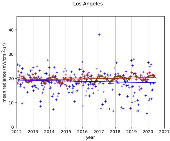 The second pattern in Figure 5 is that for Los Angeles, there was a minor increase of 0.13%/year over time in the mean radiance in this time series during the period, based on the trend from linear regression. The increasing trend is clearer from 2016 and onward, which represents urban growth (population increased from 3.9 M to 4 M or 2.5% during the period), while before 2016 this was not the case, in fact, a downward trend may be observed from 2012 to 2016 (with a slope of −0.06/year in linear trend). However, one caveat in interpreting this light intensity change is that there are two opposing effects affecting light change: urbanization which would make it brighter [21]; while aerosol increase would make it dimmer. In other words, in the VIIRS/DNB observations of nightlight intensity, the following equation might apply: