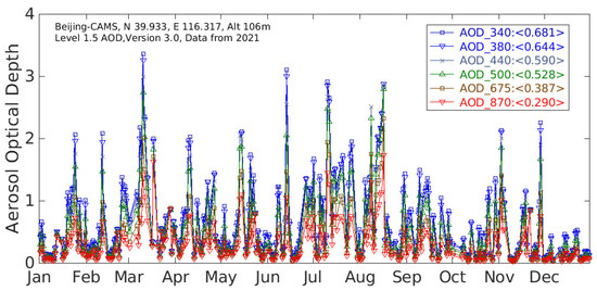 - Holben, Goloub and Chen. AERONET. 2021. Available online: https://aeronet.gsfc.nasa.gov/cgi-bin/data_display_aod_v3?site=Beijing-CAMS&nachal=2&level=3&place_code=10 (accessed on 21 June 2022).