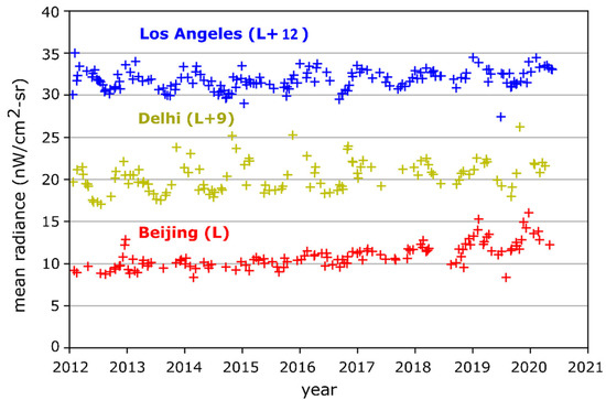 Urban night light mean radiance (L) time series (2012–2020) for Los Angeles [centered at: 34.05°N, 118.24°W] (blue: L + 12), Delhi [28.7°N, 77.1°E] (yellow, L + 9), and Beijing [39.9°N, 116.41°E] (red, L). Each data point in the plot is the mean radiance value within the AOI calculated from the VIIRS/DNB image for that day.