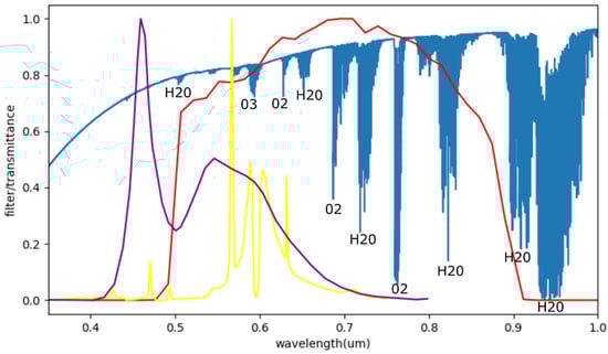 VIIRS/DNB spectral response (red), HPS (yellow) and LED (purple) spectra, and Atmospheric Spectral Transmittance (blue).