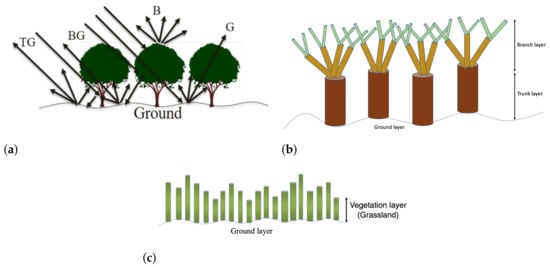 SSBM scattering mechanisms and vegetation geometry. (a) Scattering mechanisms: ground (G), branch (B), branch-ground (BG), and trunk-ground (TG). (b) Woody vegetation geometry, which consists of three layers and different scattering components. (c) Grassland vegetation geometry, which consists of two layers.