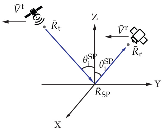 The model assumes that the ground has a zero mean surface with a small RMS surface roughness and no topography. Furthermore, it assumes the receiver altitude is much lower than the transmitter altitude. This assumption is valid for CYGNSS satellites as their altitude is about 500 , while the altitude of the GPS satellites is about 20,200 km. The first assumption simplifies the geometry of the problem. Thus, there exist ellipses on the ground that have constant delays, and parabolas that have constant Doppler frequencies [,]. The ellipse of the specular point (SP) delay has both semi-major and semi-minor axes equal to zero, making it a point. Each delay Doppler bin of the DDM corresponds to at most two points on the ground. The geometry of the problem is shown in Figure 2, where the SP position is the origin, is the transmitter position, is the receiver position, is the velocity of the transmitter, the GPS satellite, is the velocity of the receiver, the CYGNSS satellite, and is the incidence angle of the SP. Both and are parallel to the y-axis.