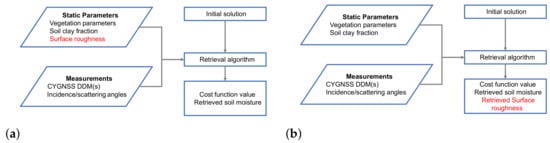 Soil moisture retrieval algorithm. The red texts highlight the differences between the two schemes. (a) First retrieval scheme: only retrieve soil moisture. (b) Second retrieval scheme: retrieve both soil moisture and surface roughness.