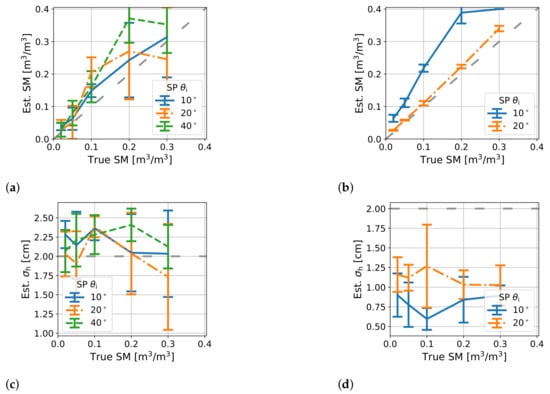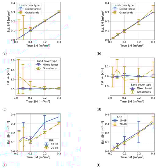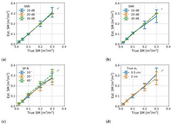 Using the first retrieval scheme, we observed that the retrieval algorithm has a negligible estimation bias. Moreover, the RMSE was proportional to the SNR, as expected. Specifically, for the first scheme with grassland vegetation cover, the RMSEs were 0.031, 0.003 and 0.0003 for SNR of 10, 20 and 30 dB, respectively. Furthermore, the correlation coefficient r was over 0.95, and it was proportional to the SNR. Figure 7 shows the performance of the first retrieval scheme with the simulated DDMs of grassland land cover, with different values of SNR, SP incidence angle, and RMS surface roughness. The error bars in Figure 7 represent one standard deviation from the mean. Figure 7a,b show the performance with various SNR values; Figure 7a is for RMS surface roughness of cm and SP incidence angle of 10°, while Figure 7b is for RMS surface roughness of 2 cm and SP incidence angle of 20°. Furthermore, Figure 7c,d show the performance for 10 dB SNR, with different values of SP incidence angles and RMS surface roughness, respectively.