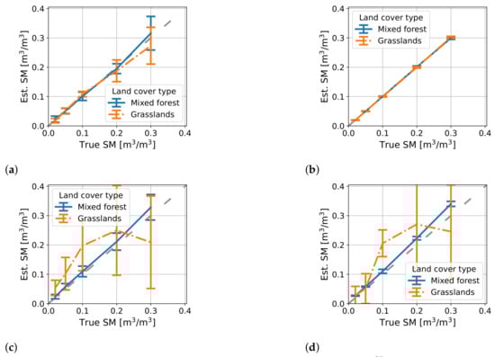 Soil moisture retrievals from simulated DDM; and , using the first scheme. The error bars represent one standard deviation from the mean, and the gray lines represent perfect retrievals. (a) Grassland land cover. (b) Mixed forest land cover. (c) Grassland land cover. (d) Mixed forest land cover.