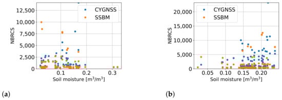 SoOp includes signals transmitted from global navigation satellite system (GNSS) and communications satellites. Due to the pervasive presence and reliability of L-band Global Positioning System (GPS)/GNSS signals, using SoOp from GPS/GNSS satellites for soil moisture retrieval has been receiving increasing attention in recent years [,,,]. For instance, NASA Cyclone GNSS (CYGNSS) was originally designed and used for sensing sea level wind speed in tropical cyclones from GNSS signals []. Recently, it was used for observations over land []. CYGNSS uses a constellation of eight satellites in low Earth orbit (LEO) at 35° orbit inclination. Each CYGNSS satellite is equipped with a four-channel GNSS bistatic radar receiver, which is capable of bistatic radar measurements of GNSS-reflectometry (GNSS-R) from land and ocean surfaces. Unlike conventional monostatic radars, the CYGNSS receivers and the GPS transmitters are not collocated. Instead, the CYGNSS satellites measure GPS signals that have been scattered from land and ocean surfaces in the vicinity of the specular direction (glistening zone) []. The CYGNSS level-1a and level-1b data products present the received power and the bistatic radar cross section (BRCS), respectively, in the form of a delay-Doppler map (DDM) [].