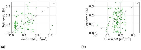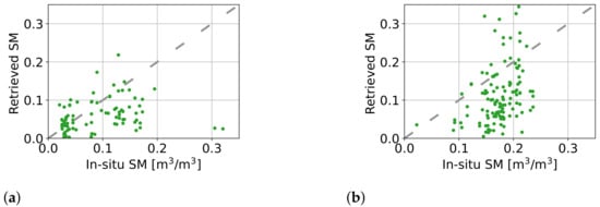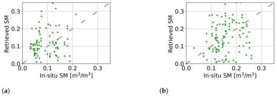 Figure 17 shows the in situ soil moisture values of station Y8 versus the retrieved soil moisture values. For 2019 DDM, the retrieved soil moisture values had an RMSE of , ubRMSE of , and a correlation coefficient r of 0.15. For the retrievals from the DDMs of 2020, the RMSE was , the ubRMSE was , and the correlation factor r was 0.21.