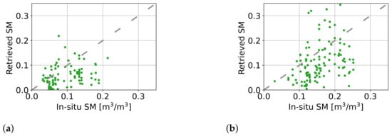 The spatial averaging of soil moisture values of multiple in situ sensors reduced the measurement noise and made the value more robust to outliers. This was the expected reason for getting better performance metrics, for most of the retrievals, compared to the soil moisture values of only the Y8 sensor, as shown in Table 2. As mentioned in the previous section, the performance metrics of all the retrievals improved with the use of spatially averaged in situ soil moisture values, except the retrievals from 2020 DDMs using the second scheme. The performance of these retrievals slightly decreased. The bias increased by , and the rest of the metrics had insignificant changes.
