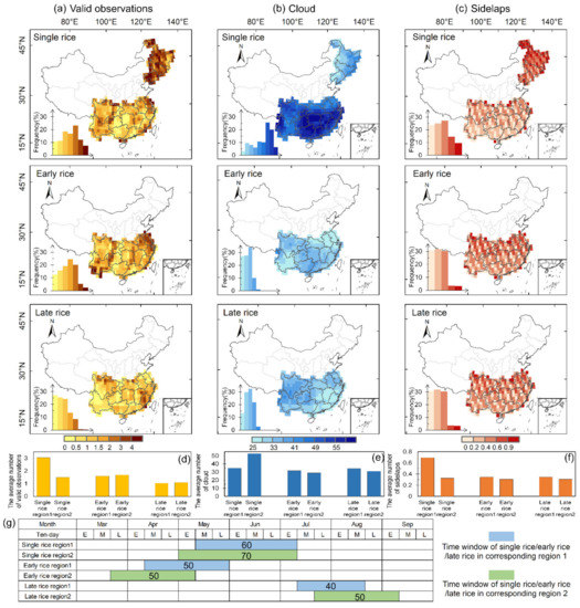 The spatial distributions and the average number of valid Landsat-8 observations (a,d), cloud (b,e), and overlap (c,f) during the period with flooding signals of single rice, early rice, and late rice at 1° × 1° grids; (g) shows the start, end, and length of the time window with flooding signals of rice paddies as determined in Section 3.1. The insets in (a–c) are the corresponding frequency diagrams.