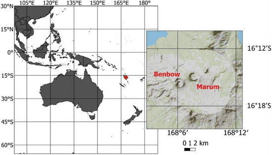 Ambrym (1334 m elevation) is one of the most active basaltic volcanoes of the Vanuatu archipelago (Figure 1), an intra-oceanic volcanic arc associated with the eastward subduction of the Indo-Australian plate beneath the Pacific plate [1,2]. This open-vent volcano (the earliest observations of Ambrym’s activity came from Captain James Cook in 1774) is characterized by a persistent degassing, with SO2 emissions exceeding 200 kg/s [3]. Due to these features, the Ambrym volcano was often investigated in order to retrieve information about volcanic processes, and their relation to the signals at the surface (e.g., [2,4]).