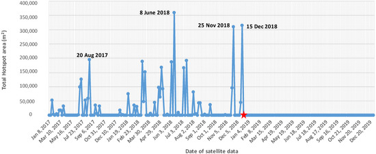 Plot of total hotspot area (m2) generated using the NHI tool. The plot integrates L8-OLI and S2-MSI observations from January 2017–December 2019; the 15 December 2018 fissure eruption is marked by a red star.