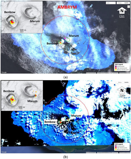 According to MIROVA (Middle Infrared Observation of Volcanic Activity), which performs operationally using MODIS (Moderate Resolution Imaging Spectroradiometer) data (at 1 km spatial resolution), effusive eruption, the first recorded since 1989, lasted about 44 h. The eruption led to values of volcanic radiative power (VRP) that were estimated at around 4000 MW [8]. An almost continuous thermal activity, ascribable to the Benbow and Marum lava lakes, was then observed in 2017, and numerous thermal anomalies were flagged throughout 2018 [9,10].