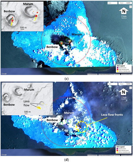 Figure 3d displays the thermal anomaly map of 15 December at 23:09 UTC, showing that the lava flow, affecting the SE flank of the Marum crater, was detected by satellite; this most likely occurred during the waning phase of eruption, as indicated by the prevalence of mid-low intensity pixels (in yellow), and by one of the two lava flow fronts, which appear even less radiant in the SWIR bands. Figure 3d also shows that the NHI algorithm did not flag hot pixels at the craters, although only the Marum crater was completely obscured by clouds. Since the day of the fissure eruption, lava lakes were no longer evident in the S2-MSI and L8-OLI scenes that were analyzed using the NHI tool (see Figure 2).