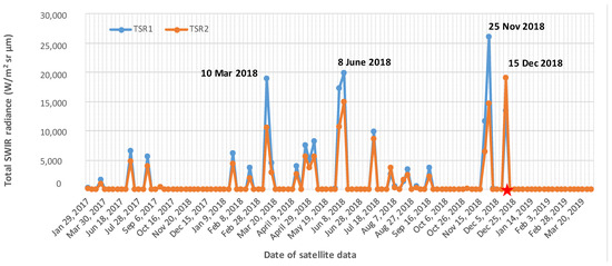 To investigate those changes, in Figure 4, we show the time series of the total SWIR1 (TSR1) and SWIR2 (TSR2) radiances of hot pixels, which are uncorrected for solar irradiation, and retrieved from the S2-MSI scenes of January 2017–March 2019 (see blue and orange curves).