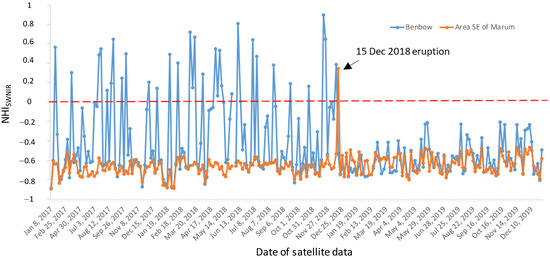 Figure 5 displays the curves of the aforementioned indicator that was retrieved over the Benbow (blue curve) crater and the SE flank of the Marum crater (orange curve), using S2-MSI scenes from January 2017–December 2019. The plot, which integrated L8-OLI and S2-MSI observations, shows that the NHISWNIR index was always negative over the SE flank of the Marum crater regardless of cloud coverage, apart from the day of the fissure eruption, when it abruptly increased because of lava effusion. On that day, the NHI indices drastically decreased at the craters, although only the Marum was almost completely affected by clouds (≈70% of cloudy pixels at Benbow).