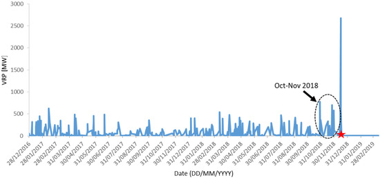 Plot of volcanic radiative power (VRP) between December 2016 and March 2019 from the MIROVA system, with indications of the period that are characterized by VRP values above 700 MW (see black ellipse), and which were recorded before the 15 December fissure eruption marked in red.