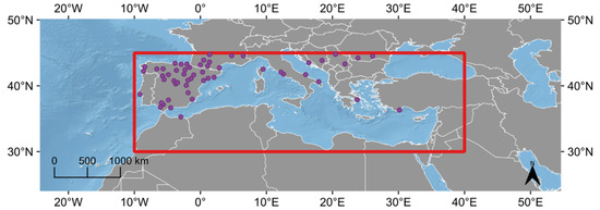 Daily maximum temperature (Tmax) data (years 1981–2020) were obtained from the Global Historical Climatology Network daily (GHCNd) database, maintained by the National Oceanic and Atmospheric Administration (NOAA) [52]. GHCNd contains daily meteorological measurements from numerous sources (over 80,000 stations worldwide) that have been merged and subjected to common quality control. A subset of the database was used, selecting the stations located within the Mediterranean region (30°N to 45°N, 10°W to 40°E) (red rectangle in Figure 1); the area boundaries used here follow the reference regions of the Sixth Assessment Report (AR6) of the Intergovernmental Panel on Climate Change (IPCC). Stations were further filtered depending on their data completeness throughout the study. Specifically, for the time series of each station, a year was discarded when more than 10% of daily values were missing during the summer season (June to August). Subsequently, stations with less than 25 years in the historical base period (1981–2010) or less than 5 years in the Aqua/MODIS temporal extent period (2002–2020) were excluded from the analysis. To avoid using MODIS pixels with high water fractions, stations close to the shoreline were not included (<1.5 km distance). It was also required that stations did not exhibit major land cover changes during the study period (i.e., from a vegetated type to urban/bare soil or vice versa). The land cover type of the stations was derived using the MODIS Land Cover Type Version 6 product (MCD12Q1) which provides global land cover types at yearly intervals (2001–2020) at a 500-m resolution [53]; the MODIS International Geosphere-Biosphere Programme (IGBP) scheme was selected. 58 GHCNd stations in the Mediterranean region satisfied the above criteria and were included in this study. The spatial distribution of these weather stations can be seen in Figure 1; a full listing of the stations is given in Appendix A (Table A1). The 20-year modal IGBP land cover value was assigned to each station. The majority of the stations were classified as urban (40%); grasslands (17%), croplands (15%), and savannas (12%) were also frequent land cover types in the study area.