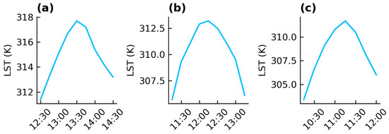 Mean daytime MODIS LST (Aqua, MYD11A1) (June–August 2002–2020) as a function of the local overpass time (in UTC) for the locations of GHCNd stations (a) SP000008410 (Cordoba, Spain), (b) IT000016239 (Rome, Italy), and (c) TU000017375 (Finike, Turkey).