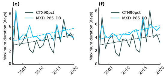 The degree that the identified events align in terms of climatology and trends can further be seen in Figure 3a–d, which presents annual (summer season) metrics (number of events and days) for heatwaves and LST anomalies (MXD_P85_D3). It is evident that the derived LST anomalies largely follow the aggregate climatology of the region with a strong agreement on a year-to-year basis. Notable extremes, such as the 2003 European heatwave, are also well reproduced. Additionally, the average length of the longest event per year (Figure 3e,f) shows coherence between LST and Tair, except for a slight overestimation for MXD_P85_D3 in a few of the years. For both heatwaves and LST anomalies, statistically significant (p < 0.05) rising heatwave metric trends were observed, indicating that extreme hot days are becoming more frequent and persistent. For daytime (nighttime), heatwaves exhibit increasing trends of 1.65 (1.52) days/dec in frequency between 2002 and 2020; LST anomalies increased at a similar rate, 1.35 days/dec for daytime and 1.64 days/dec for nighttime. It is worth noting that the rising trends and the alignment between the two approaches were quite robust regarding the choice of the base period for heatwave detection. As expected, however, the computed values for trends are shaped by the base periods; e.g., computing heatwaves using the reference period 2002–2020, a statistically significant positive trend for HWF of 0.92 (0.75) days/dec for daytime (nighttime) was found.