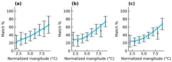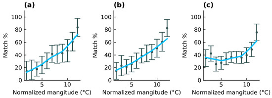 Match percentage between heatwave days and LST anomalies as a function of the normalized heatwave magnitude during daytime for (a) MXD_P85_D3, (b) MXD_P90_D2, and (c) MXD_P95_D1; blue curves correspond to the lowess regression lines; error bars correspond to half standard deviation.