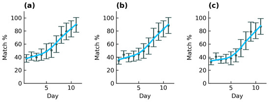 Match percentage between heatwave days and LST anomalies as a function of the number of days since the start of an episode during daytime for (a) MXD_P85_D3, (b) MXD_P90_D2, and (c) MXD_P95_D1; blue curves correspond to the lowess regression lines; error bars correspond to half standard deviation.