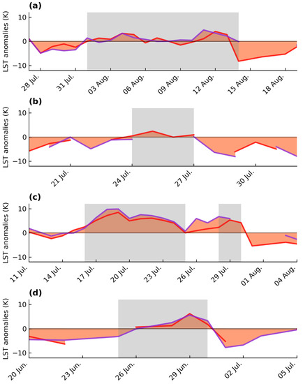 LST anomalies during selected heatwaves in the Mediterranean. (a) the 2003 heatwave in Central Europe (FRE00104112; Embrun, France), (b) the 2006 heatwave in France (FRE00104907; Montélimar, France), (c) the 2007 heatwave in the Balkans (ROE00108893; Craiova, Romania), and (d) the 2019 heatwave in Central Europe (SPE00120350; Pamplona, Spain). Shaded areas indicate the dates under a heatwave episode (CTX90pct). The red line corresponds to Terra/MODIS and the purple line to Aqua/MODIS.