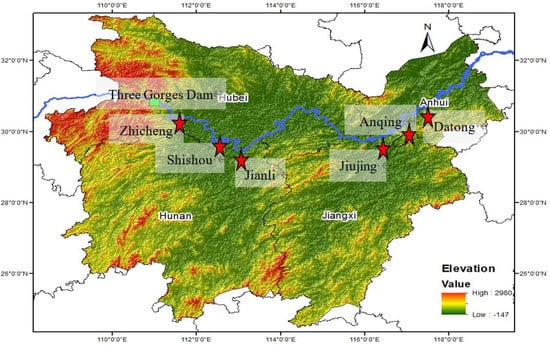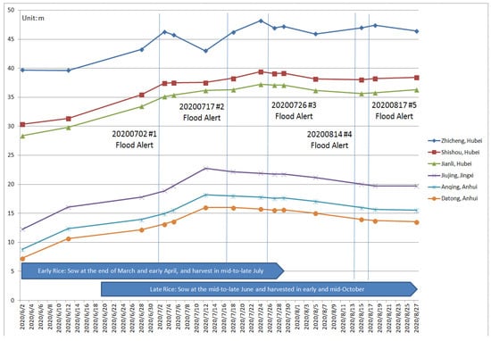 From early June to late August 2020, heavy rainfall of a long duration and broad impact caused by the regional rainy season led to floods severely affecting large middle and southern areas in China, including the whole Yangtze basin. The PRC government issued five rare flood warning alerts in a short period from 2 July to 17 August. According to the press conference hosted by the PRC’s Ministry of Emergency Management on 13 August 2020, rainfall during the year’s rainy season (62 consecutive days) in the middle reaches of the Yangtze River reached 759.2 mm, which is the highest level since 1961. The water level in both Dongting Lake and Poyang Lake exceeded the guaranteed water level, and the water level in the Chao Lake was the highest in history. The disaster affected 6.03 million hectares of crops, of which 1.14 million hectares had no harvest, mainly in the middle and lower reaches of the Yangtze River and surrounding area. In our study area, early rice is sown in late March and early April and harvested in mid- to late July; late rice is sown in mid- to late June and harvested in early and mid-October. According to the data announced by the PRC government from early June to late August, with daily rainfall conditions and reservoir regulation, the water level along the Yangtze River increased significantly, as shown in Table 1 [22] and Figure 2. In fact, some cropland in our study area experienced rain and flood for almost 2–3 months in 2020.
