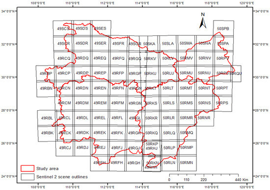 The Sentinel-2 mission comprises a constellation of two polar-orbiting satellites placed in the same sun-synchronous orbit. They are phased at 180° to each other. Sentinel-2 is also a wide-swath, high-resolution, multispectral imaging mission supporting Copernicus Land Monitoring studies, including monitoring vegetation, soil, and water cover and observation of inland waterways and coastal areas. Sentinel-2’s wide swath width (290 km) and high revisit time (10 days at the equator with one satellite and five days with two satellites under cloud-free conditions, which results in 2–3-day resolution at mid-latitudes) make it easier to monitor variability in land surface conditions and support monitoring of Earth’s surface changes. Sentinel-2 carries an optical instrument payload that samples 13 spectral bands: four bands at 10 m, six bands at 20 m, and three bands at 60 m spatial resolution. The twins of Sentinel-2 provide continuity of SPOT and LANDSAT-type image data, contribute to ongoing multispectral observations and benefit Copernicus services and applications, such as land management, agriculture and forestry, disaster control, humanitarian relief operations, risk mapping, and security concerns [28,29,30]. There are 92 scenes covering our study area, as shown in Figure 4.