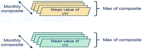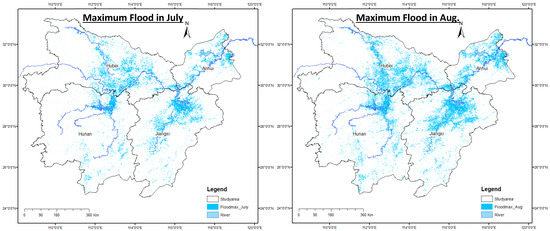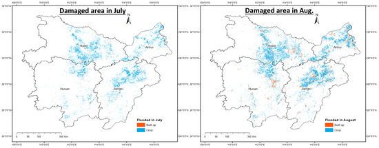 Because the study area is enormous and Sentinel-1imagery cannot cover such a large area every day, we try to generate the Monthly composite flooding map with the online Google Earth Engine to represent the actual flooding situation in this event [44]. As shown in Figure 9, VH and VV are single-polarization data of Sentinel-1. We compiled monthly composite flooding data from Sentinel-1, and there were 95 and 103 Sentinel-1 SAR GRD imagery acquired in July and August 2020. Even the Sentinel-1 SAR GRD imagery were not affected by rain and cloud, the data still had a high noise-to-signal ratio. That is why we took the Mean value of VH/VV polarization imagery to reduce the noise and stack them to generate the monthly composite flooding map. With the permanent water body extracted in Section 2.3.1, we can exclude the permanent water body and have a refined monthly flooding map. Based on this product, it is easier to identify which area is covered underwater during July and August 2020 (as shown in Figure 10). Finally, we can overlap and intersect the cropland and refined monthly flooding map layers to generate the “damaged cropland area map” in July and August 2020 (as shown in Figure 11). Therefore, we can assess and quantify the impacts of the 2020 flood on crop production in our study area listed in Section 2.1.