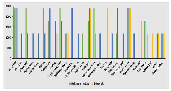 This research utilized the ground truth data prepared in the previous study [54]. The ground truth data were prepared by field survey, accompanied with an existing vegetation survey map (1:25,000 scale), and visual interpretation of the time-lapse images available in Google Earth. The sample points (longitudes and latitudes) were prepared from homogenous areas belonging to each land cover and vegetation type concerned. In total, 1200–2400 sample points were prepared for each land cover and vegetation type for each site. The vegetation types were classified by adopting the genus–physiognomy–ecosystem system developed for satellite-based classification of plant communities in the previous study [55]. The ground truth data were prepared by considering unchanged areas between 2018–2020. However, since the study sites were usually devoid of human disturbances and landscape changes, the ground truth data could represent a few more nearby years. The distribution of the ground truth data size for each site is shown in Figure 2. The sample points were prepared by considering the proportional coverage of the land cover and vegetation types in each site. Therefore, vegetation types with large coverage, such as Abies ECF, Quercus DBF, and Fagus DBF, consisted of large sample sizes; whereas low-coverage vegetation types such as Acer DBF and Quercus Shrub received small sample sizes. This research dealt with the classification and mapping of 16 land cover and vegetation types in Hakkoda, 23 land cover and vegetation types in Zao, and 12 land cover and vegetation types in Shiranuka.