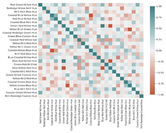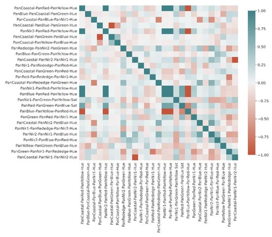 For the very high-resolution suite, nine radiometric indices were calculated (Table 1) and combined with the multi-spectral image consisting of 8 bands (coastal, blue, green, yellow, red, red edge, near infrared 1, and near infrared 2), which yielded 17 spectral–radiometric features. In addition, the 8-band multispectral images were transformed into the Hue–Saturation–Value (HSV) color space. For this purpose, by taking 3 out of the 8 bands at a time, 120 permutations were calculated which yielded 336 sets of RGB images (1008 features). OpenCV (https://opencv.org, accessed on 15 April 2022)—Open Source Computer Vision Library—was used for the HSV transformations. It produced a large dimension of data in which some features exhibited multicollinearity. To cope with the complexity associated with the multicollinearity, 27 least-correlated features were extracted and combined with the 17 spectral–radiometric features prepared earlier.