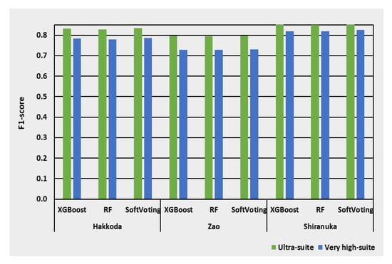 The 10-fold cross-validation accuracies obtained from the two categories of features extraction suites (very high-resolution versus ultra-resolution) proposed in this research have been shown in Table 3 and Table 4. In all three sites (Hakkoda, Zao and Shiranuka) studied in this research, the SoftVoting classifier showed slightly better performance than the other two classifiers (XGBoost and Random Forests) without a substantial difference among the three classifiers (XGBoost, Random Forests, and SoftVoting).