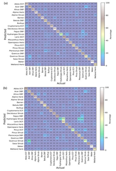 The confusion matrix figures calculated with the 10-fold cross-validation method using the SoftVoting classifier for the Hakkoda, Zao, and Shiranuka sites are shown in Figure 9, Figure 10 and Figure 11, respectively. Though most of the classes were discriminated satisfactorily, weak classification of some classes, for instance Juglans DBF, Fagus DBF, and Alnus DBF in site Hakkoda (Figure 9); Hydrangea Shrub and Pinus ECF in site Zao (Figure 10); and Salix DBF and Wetland Herb in site Shiranuka (Figure 11) was detected.